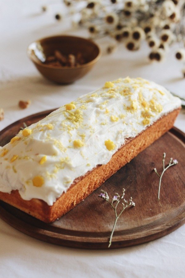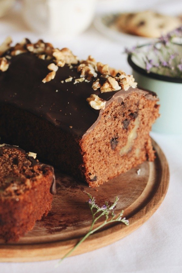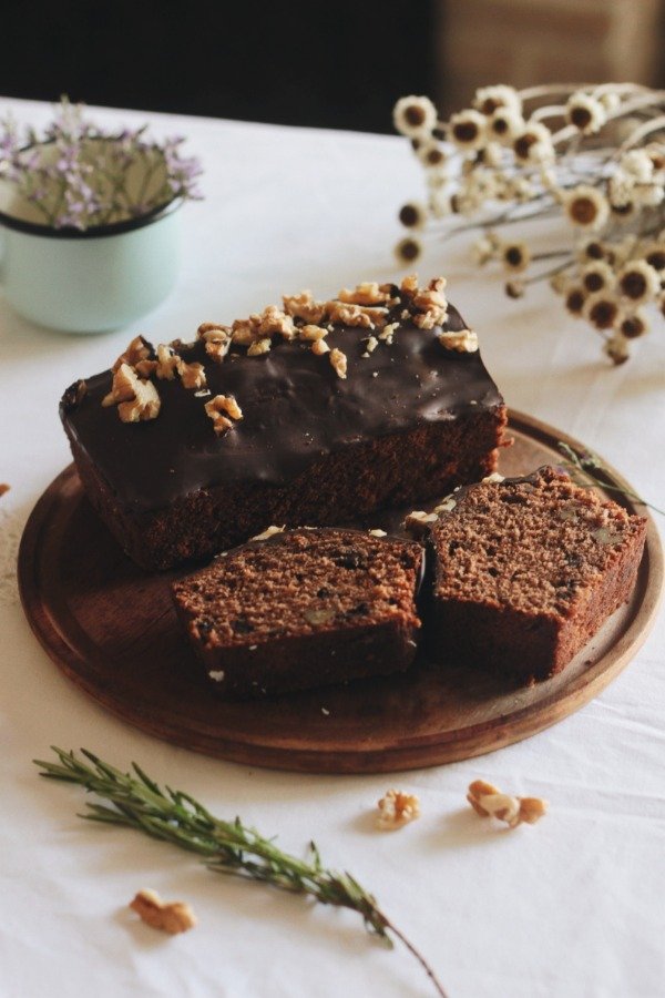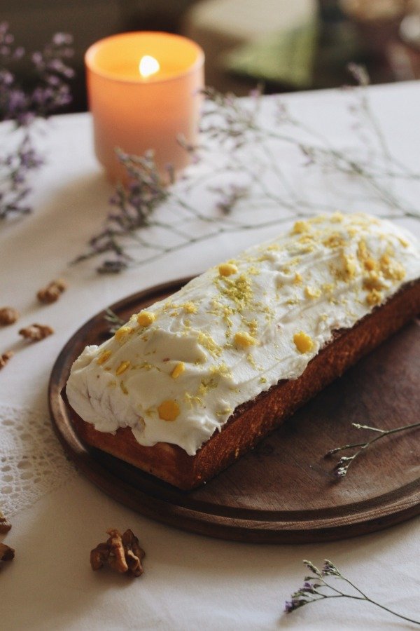 El budín de Carrot Cake es un clásico budín especiado de zanahoria, con almendras y pasas rubias. Además está bañado en chocolate blanco y tiene cascaritas de naranja confitadas.